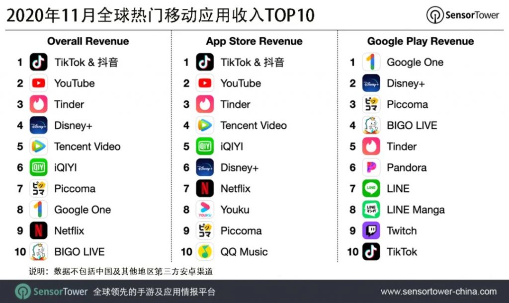 榜单前五名别的 3 款使用为 Tinder、Disney+ 和腾讯视频。
