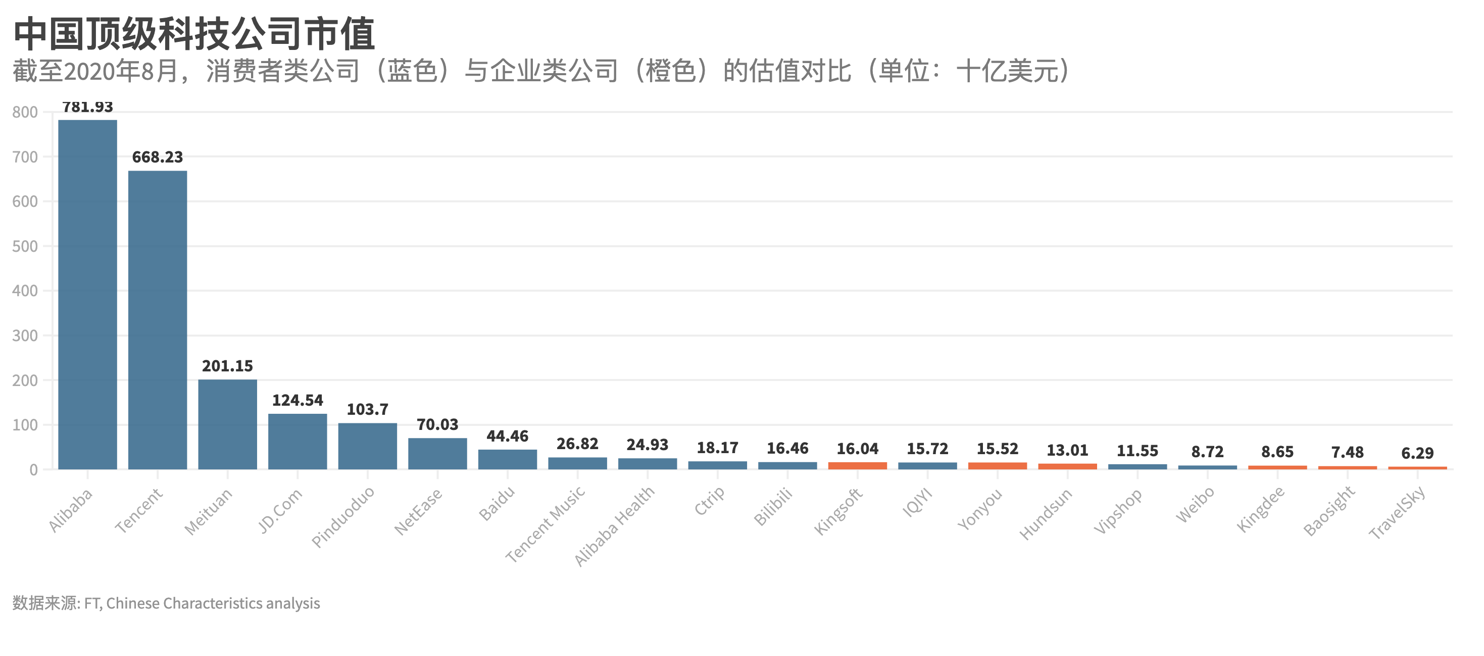 相比之下,在下图(我国20大科技公司市值)中,企业服务类型的公司则别离占有了总数的30%和总市值的3%,而且其间没有一个为SaaS类公司。