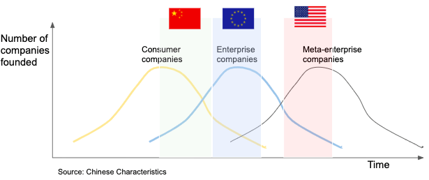 根据对企业向草创公司一般会向顾客级草创公司看齐的趋势发现,我把中、欧、美三地的科技生态体系做出了以下排序: