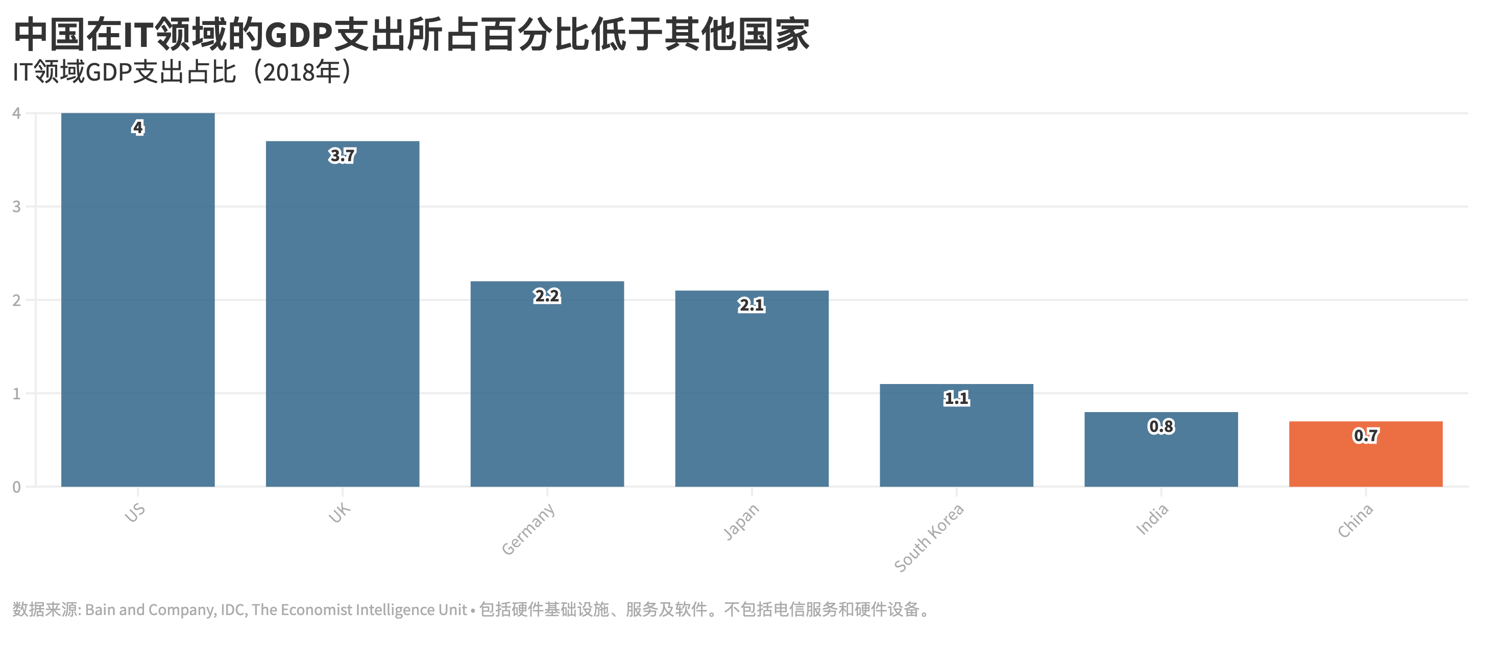 稀有据标明,2019年我国SaaS商场的市值规划约在37亿到60亿美元之间,不到全球SaaS商场份额的6%。在贝恩咨询发布的图表中,咱们能够看到,就本身体量而言,我国在IT相关范畴的出资是落后于其他国家的。