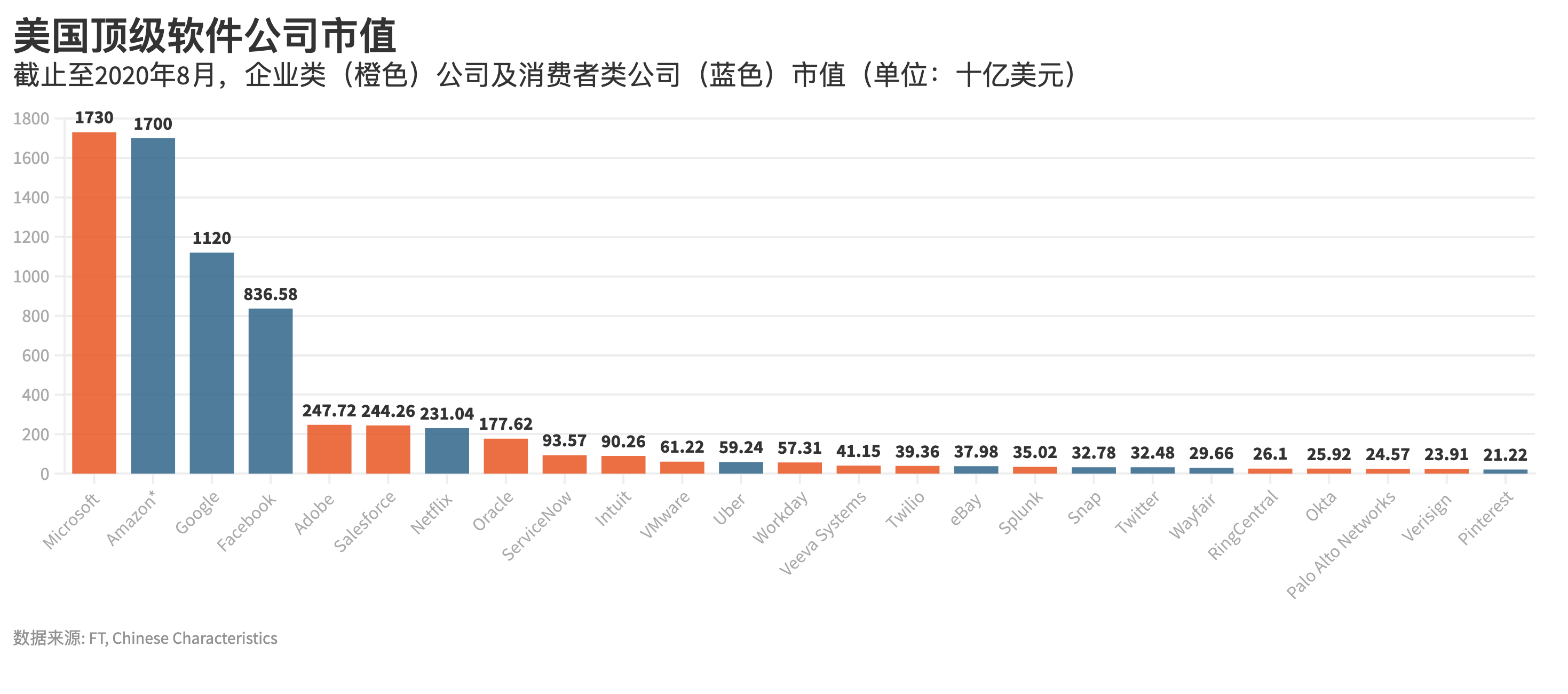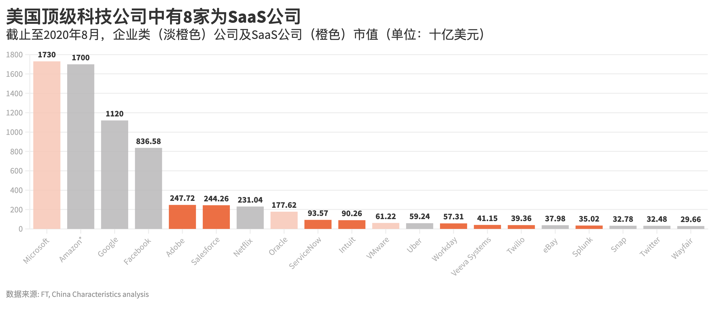 以美国20大科技公司市值作为基线(截止至8月29日),面向企业服务的公司占有了总数量的55%以及总市值的40%。
