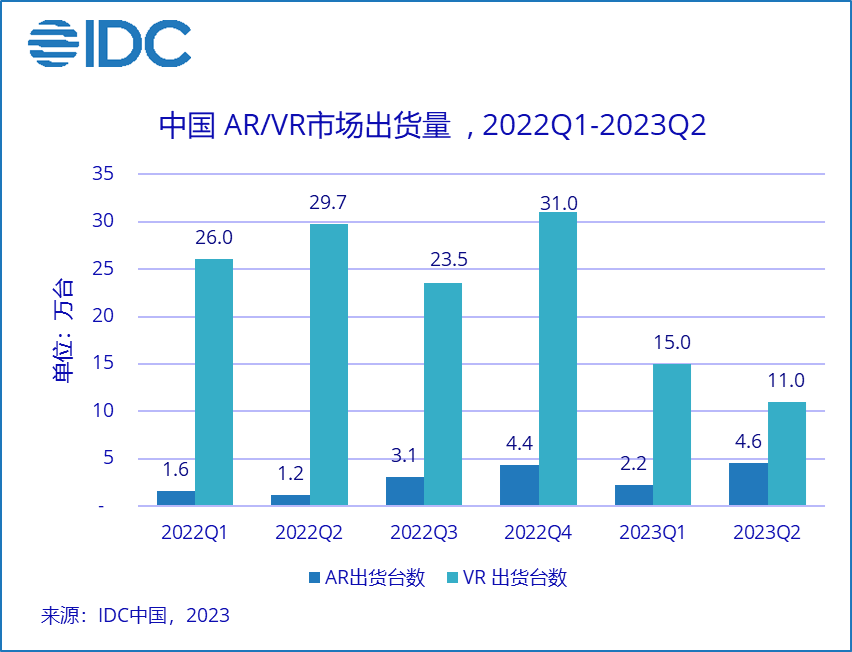 IDC数据显现,2023年上半年,我国AR/VR头显出货32.8万台(sales in 口径),同比下滑44%。其间AR出货6.8万台,同比上涨142%;VR出货26万台,同比下滑53.3%。